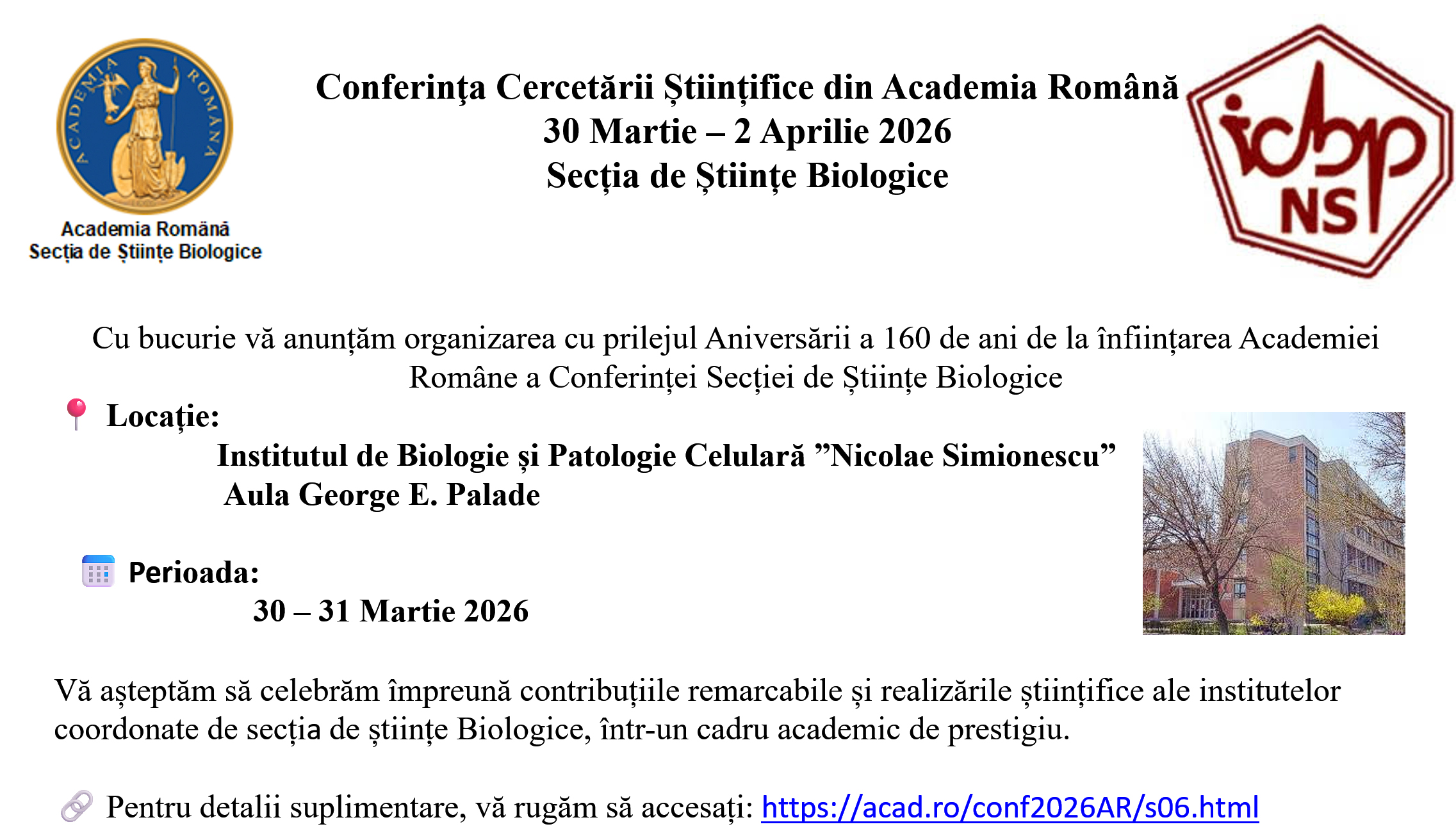 30 Martie – 2 Aprilie 2026 Conferinţa Cercetării Științifice din Academia Română, Secția de Științe Biologice