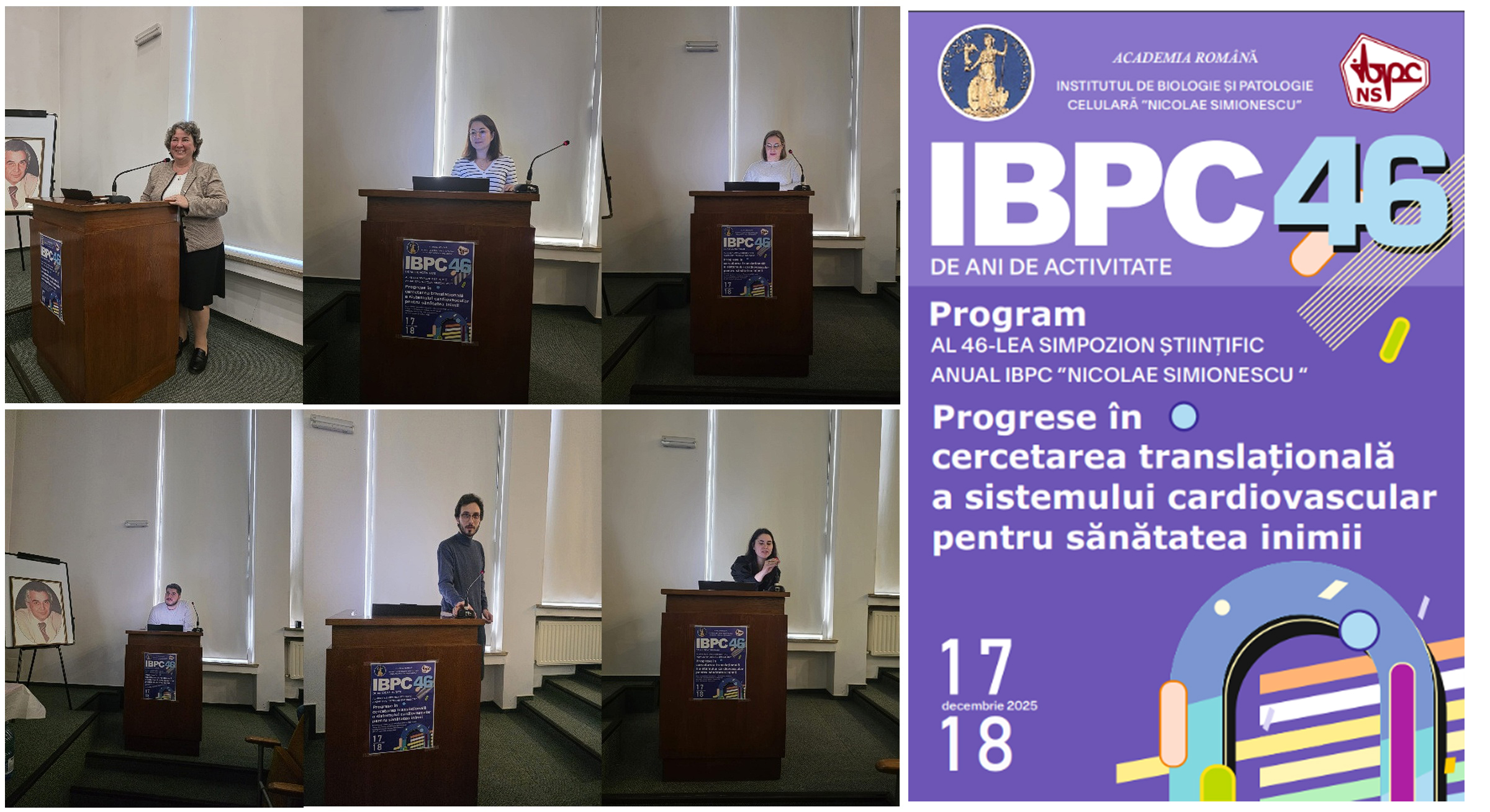 Participare la Al 46‑lea Simpozion Științific Anual IBPC‑NS – Progrese în cercetarea translațională a sistemului cardiovascular pentru sănătatea oamenilor. Evenimentul a urmărit consolidarea identității științifice a institutului în domeniul biologiei și patologiei cardiovasculare, prin diseminarea realizărilor recente și prin creșterea vizibilității în comunitatea academică și profesională. Simpozionul a integrat comunicări științifice, sesiuni de postere, prezentări ale tinerilor cercetători și momente festive, contribuind la coeziunea comunității IBPC‑NS. În cadrul acestui eveniment, Prof. Kyriakos KYPREOS și Dr. Anca Gafencu au prezentat rezultatele obținute în proiectul STROMA.