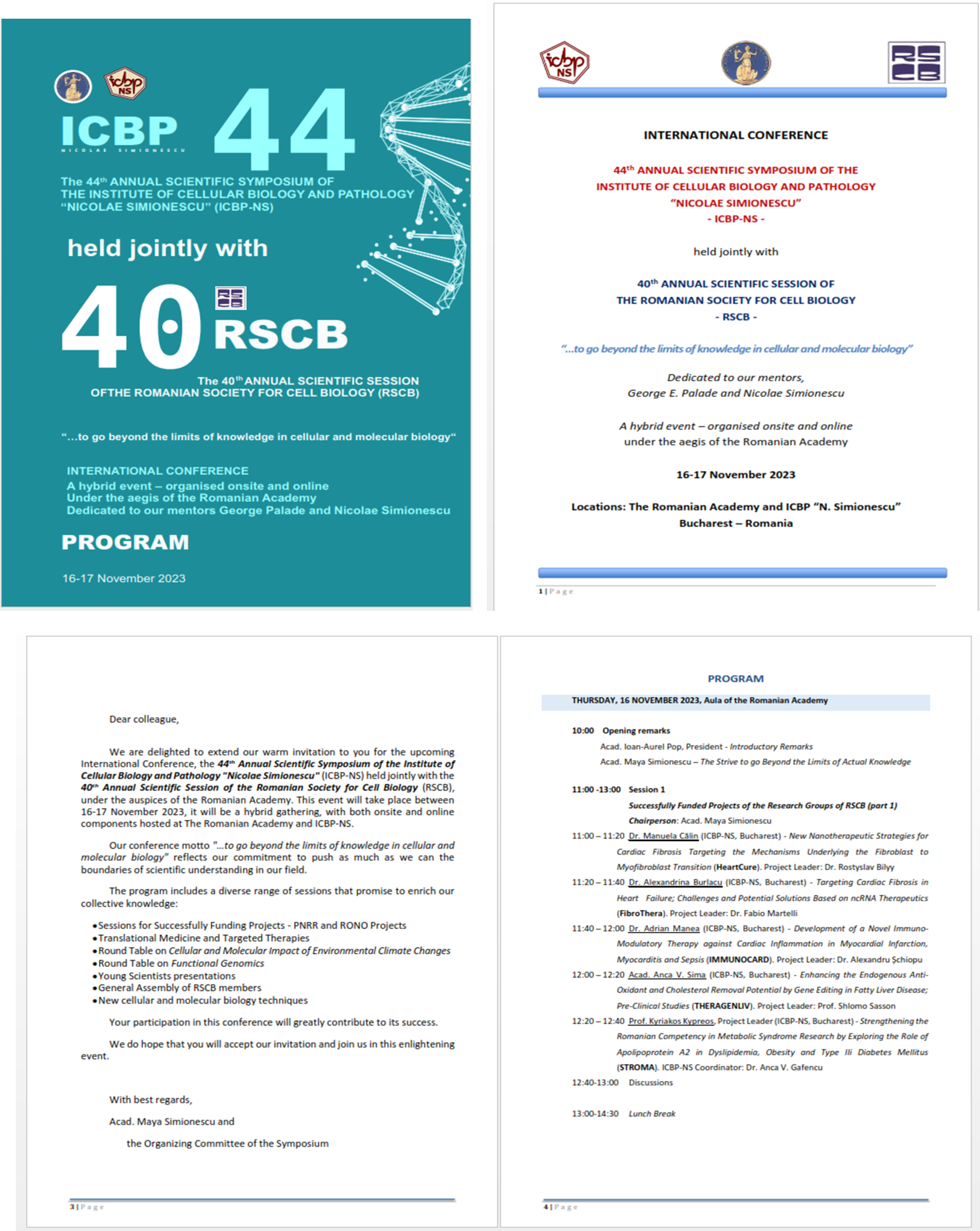 "pentru a depăși limitele cunoașterii în domeniul biologiei celulare și moleculare" sesiune dedicată mentorilor George E. Palade și Nicolae Simionescu, eveniment organizat sub egida Academiei Române 16-17 noiembrie 2023, desfășurat la Academia Română și ICBP "N. Simionescu". Mai jos este programul ședinței, posterul de promovare a evenimentului si imagini din cursul prezentării Prof. Kypreos.