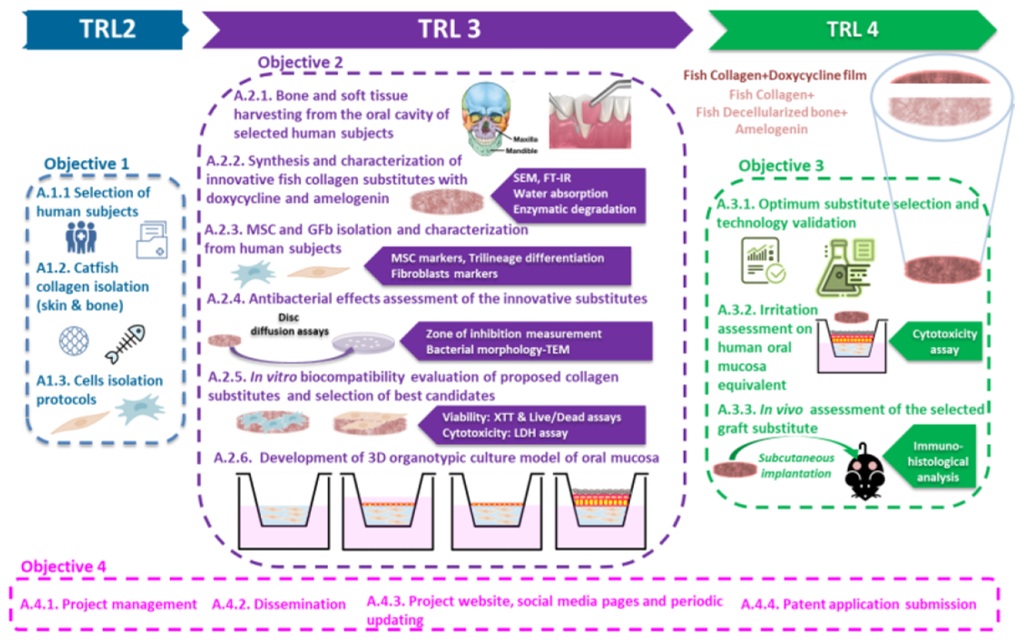 SUMMARY Implant based tooth replacement became today the gold standard for treating tooth loss, but the main challenge in this treatment is represented by alveolar bone (AB) deficiency. Resorption of AB after dental extraction and implant placement is a serious problem. The project aim is to find solutions for antibacterial treatment and for increasing AB and gingival tissue (GT) repair by guided regeneration using double layer 3D spongious collagen-doxycycline-amelogenin substituent (Coll-Dox-Am). This substitute represents an alternative biomaterial that supports bacterial inhibition and favours a 3D microenvironment for bone and GT regeneration in severe periodontitis and craniofacial reconstruction. The proposed solution consists in the development of a double layer Coll-Dox-Am based on catfish (Silurus glanis) collagen to promote regeneration of AB and GT. The first thin layer made of collagen-doxycycline will induce the development of GT while also inhibiting the growth of bacteria. The second layer with 3D structure will consist of collagen mixed with decellularized catfish bone and amelogenin that will target the restoration of the AB. These two layers will have different degradation rates: the membrane will be resorbed after 5 days, being present only during the antibiotic's action, while the second layer will offer sufficient time for the tissue to heal up to complete resorption. Using Coll-Dox-Am, the significant benefits for the patient’s health and welfare are expected. |