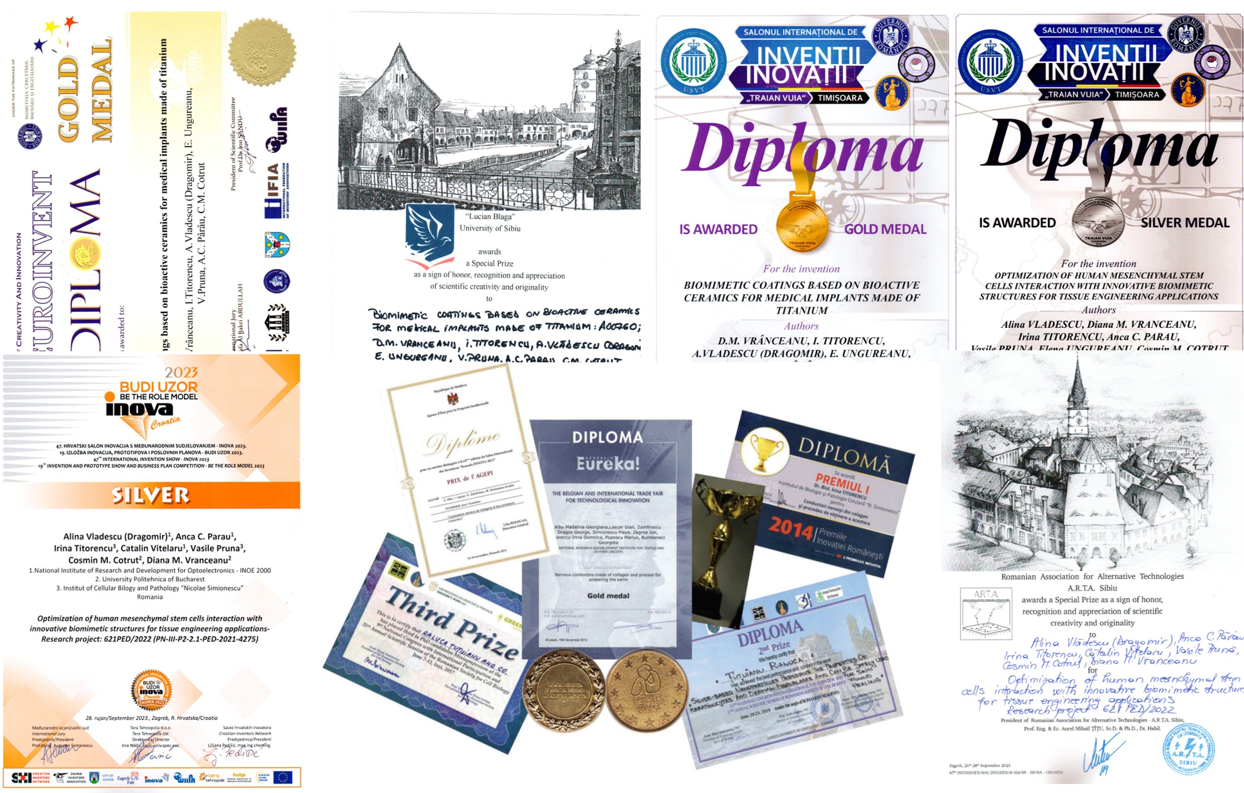 - Gold Medal at the International Exhibition INVENTCOR, 4th Edition, September 14–16, 2023, Deva, Romania, for “Optimization of human mesenchymal stem cells interaction with innovative biomimetic structures for tissue engineering applications”, authors: Alina Vlădescu, Anca C. Părau, Irina Titorencu, Vasile Prună, Cosmin M. Cotruţ, Diana M. Vrănceanu; Project No. 621PED/2022 (registration code: PN-III-P2-2.1-PED-2021-4275).