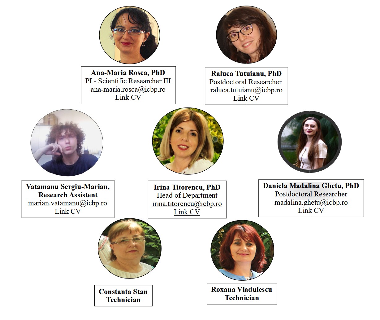 RESEARCH STAFF: PhD Irina Titorencu Head of department (email: irina.titorencu@icbp.ro); PhD Ana Maria Rosca, PhD Raluca Tutuianu, PhD Student Daniela Madalina Ghetu, Sergiu-Marian Vatamanu, Constanta Stan technical assistant, Roxana Vladulescu technical assistant